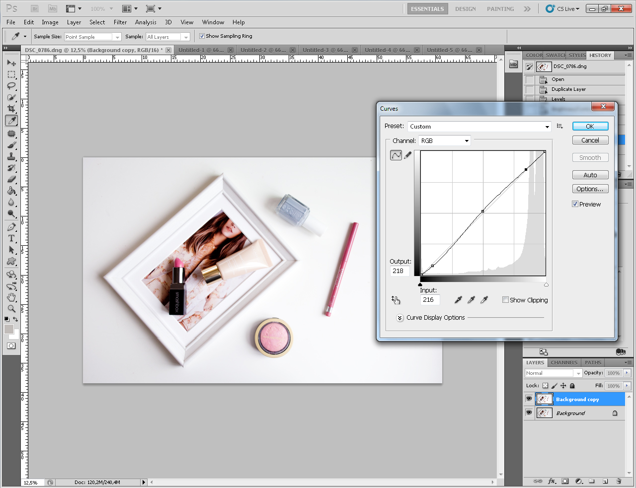 P.S.- когда я делаю свотчи или показываю продукт в макияже, то делают только цветокоррекцию в Camera Raw и настраиваю Levels и Curves.